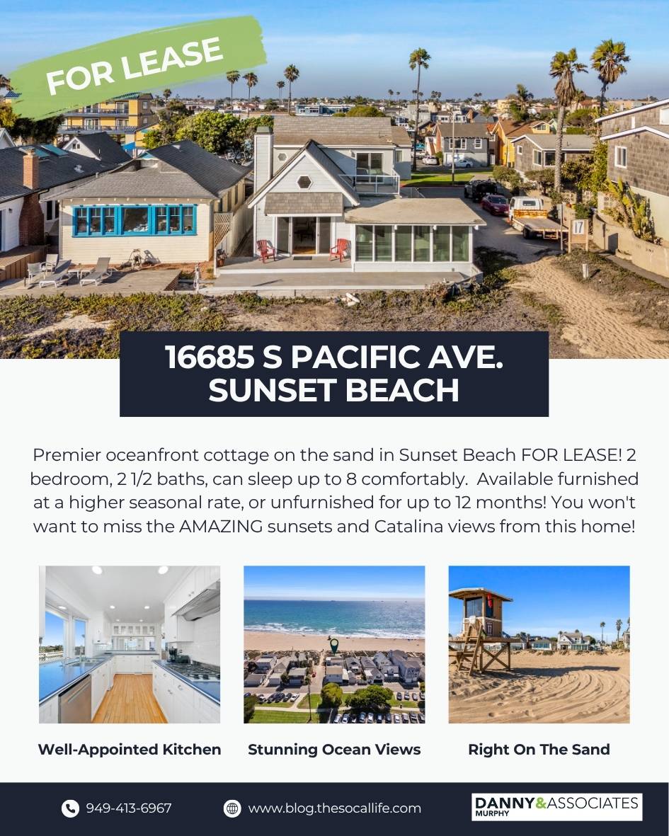 Premier oceanfront cottage on the sand in Sunset Beach FOR LEASE! 2 bedroom, 2 1/2 baths, can sleep up to 8 comfortably. Available furnished at a higher seasonal rate, or unfurnished for up to 12 months! You won’t want to miss the AMAZING sunsets and Catalina views from this home!