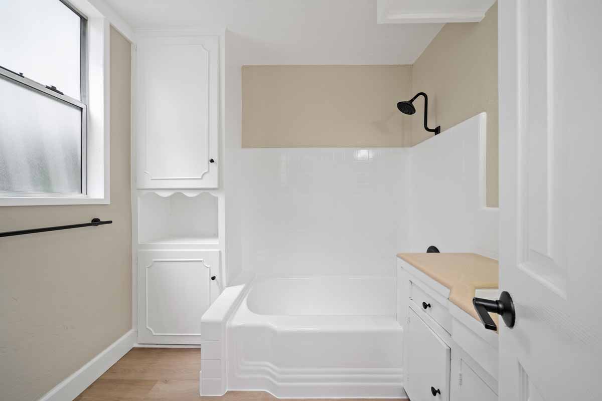 white shower and tub combo in a neutral bathroom with white cabinetry.