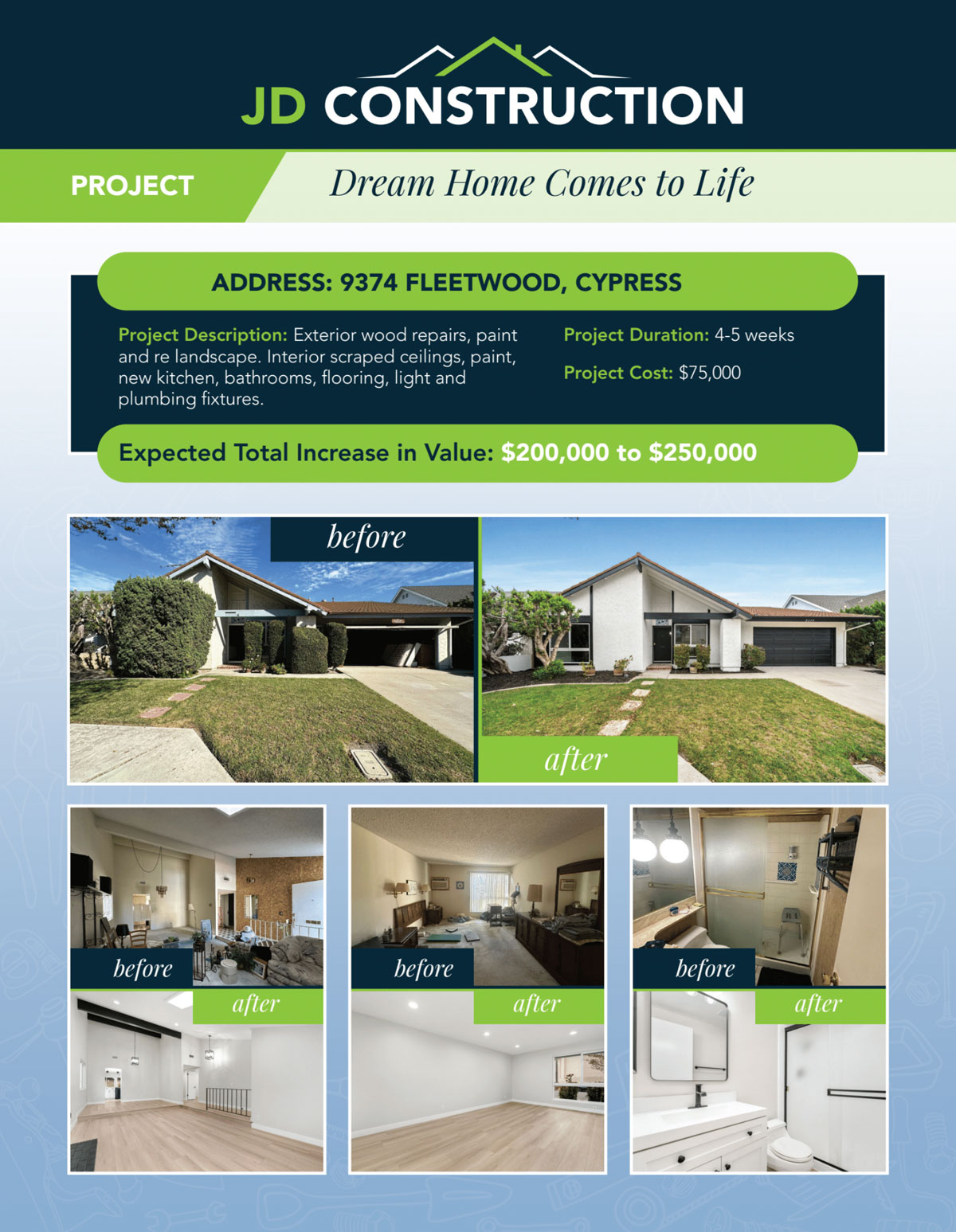 9374 Fleetwood Remodel Remodel of 9374 Fleetwood in Cypress CA before and after images of front of home and inside of home.