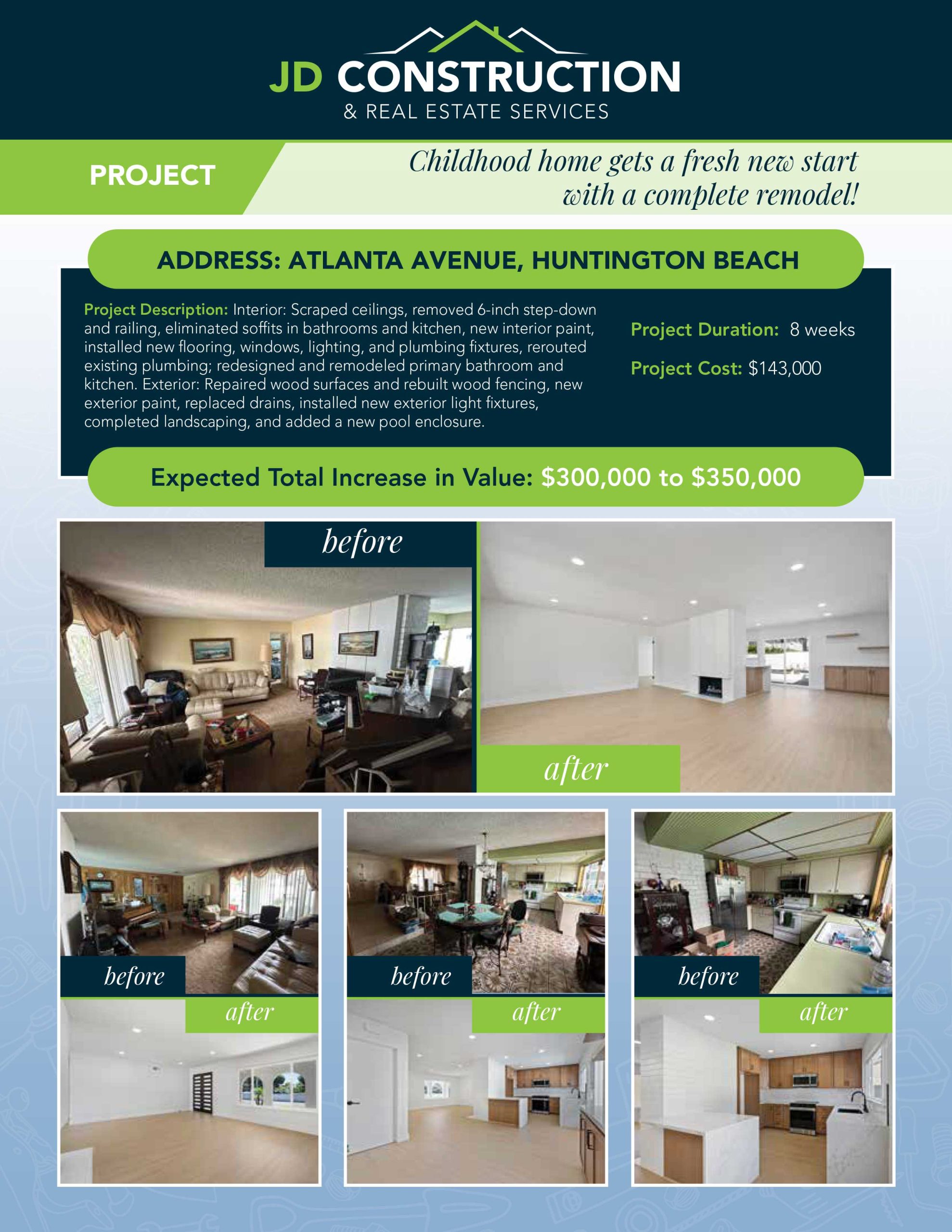 Located in the heart of Huntington Beach, 8401 Atlanta Ave underwent a thoughtful remodel designed to elevate both style and functionality. In partnership with Danny Murphy & Associates, JD Construction brought this home to life with expert craftsmanship, modern updates, and a focus on maximizing market appeal. Every room was carefully considered—from refreshed living spaces to upgraded kitchens and bathrooms—ensuring the home feels bright, open, and move-in ready.